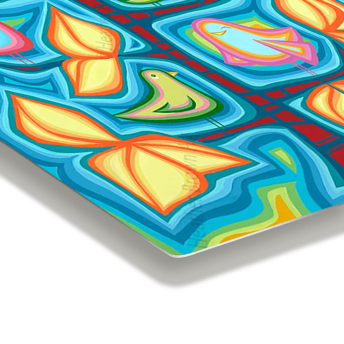 A metal art print featuring friendly birds hanging out together in a colorful tree by Hawaii surf artist Heather Brown