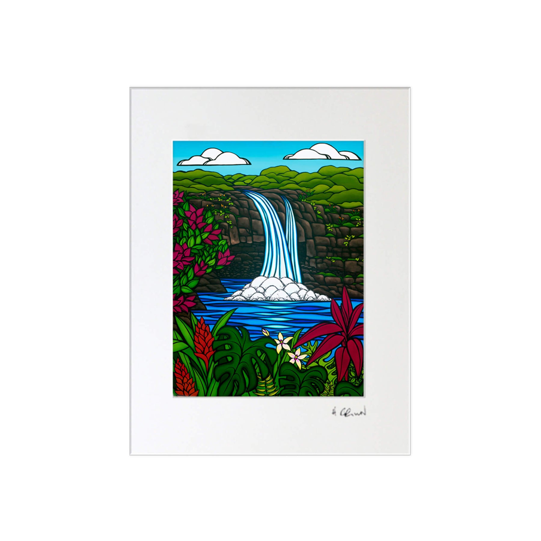 A matted art print featuring a tranquil pool, waterfall, tropical flowers, mountains, and a beautiful blue sky by Hawaii surf artist Heather Brown