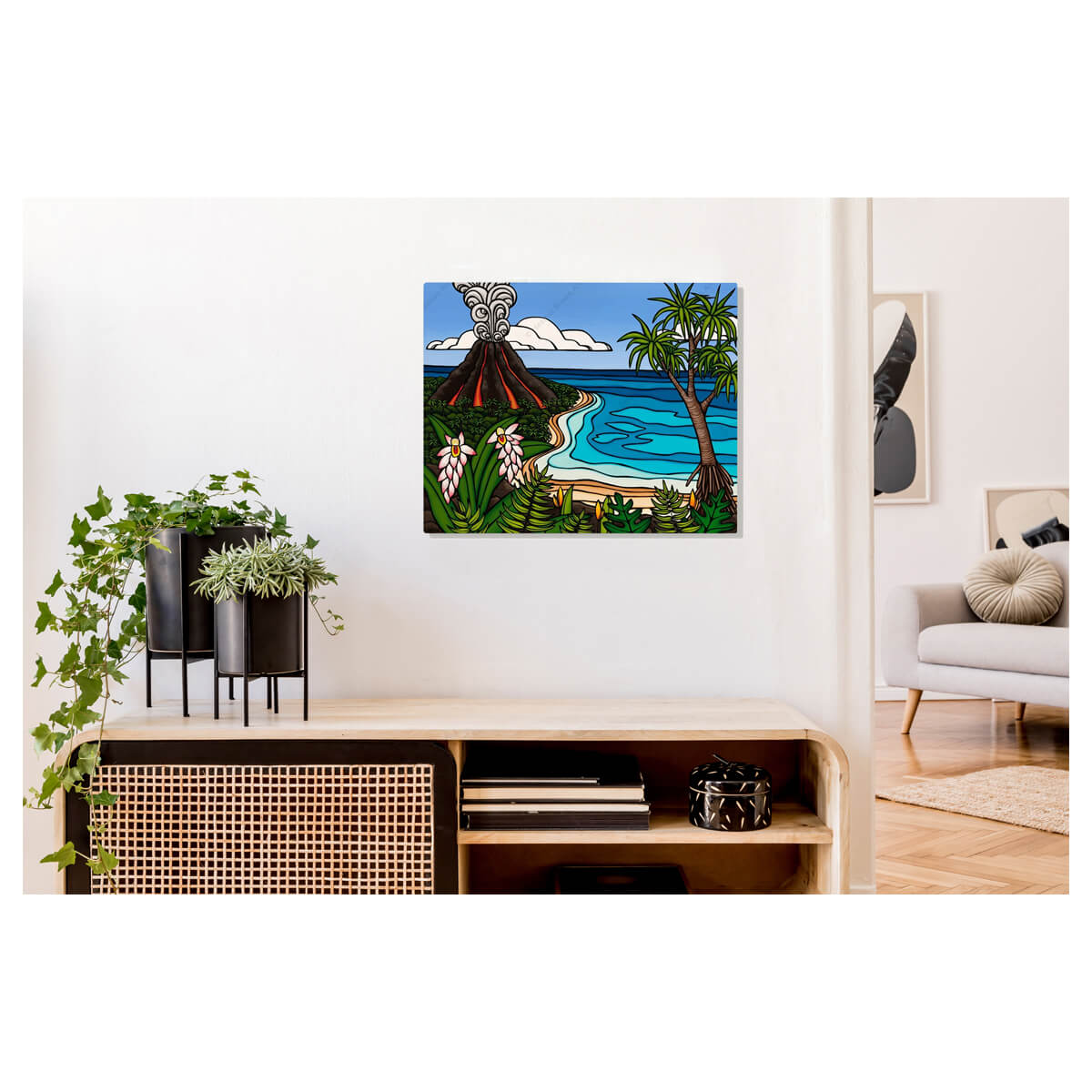 A metal art print featuring a volcano erupting in the distance on a tropical Hawaiian island by Hawaii surf artist Heather Brown