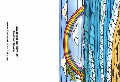 Greeting card artwork by Heather Brown featuring a rainbow framing an iconic view of a Hawaii beach.
